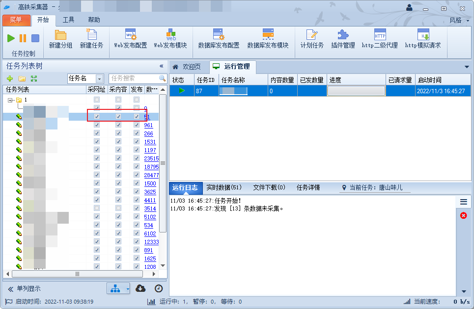 所有设置都配置好了之后就直接保存并退出,然后进入主页面,勾选任务右边的“采网址”、“采内容”、“发布”复选框,右击任务并选择开始即可,如果看到运行日志中运行正常就可以让它静默采集了,如果有提示错误,分析错误产生原因,然后对症下药就行了。