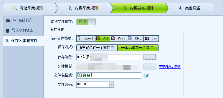 我们将本地文件保存打开,以txt文件格式输出为例,我们选择txt,并设置保存位置为自定义位置,文件模板我使用的是: