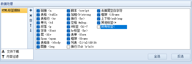 对于我来说,AI写作训练不需要标签,所以我需要在采集的时候直接过滤掉,所以我在内容标签下的数据处理中,选择html标签过滤,直接全选了所有标签。为了阅读方便,我取消了换行和所有标签,当然我们也可以通过对数据的处理输出我们需要的内容。