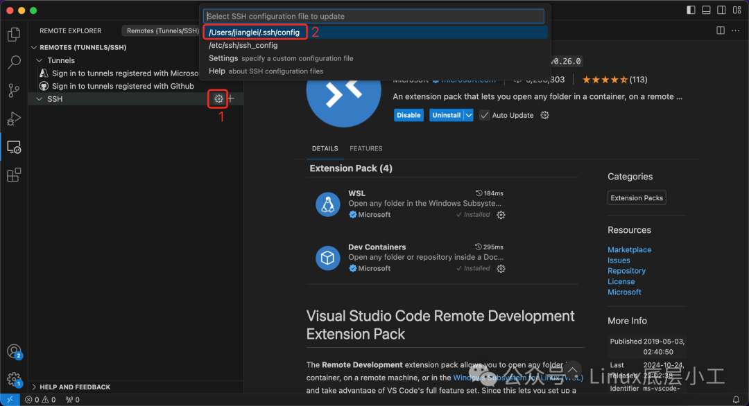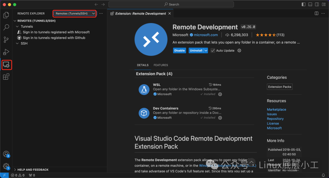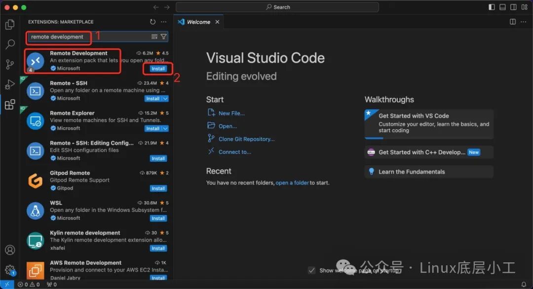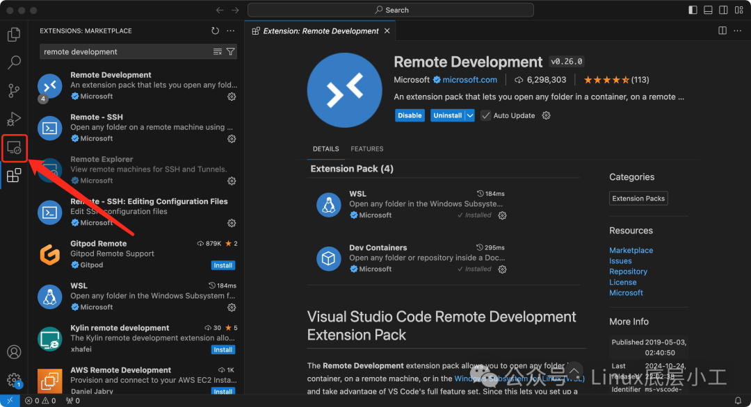 第一步就是要在VSCode中安装Remote Development插件,在插件中心搜索remote,点击安装Remote Development即可: