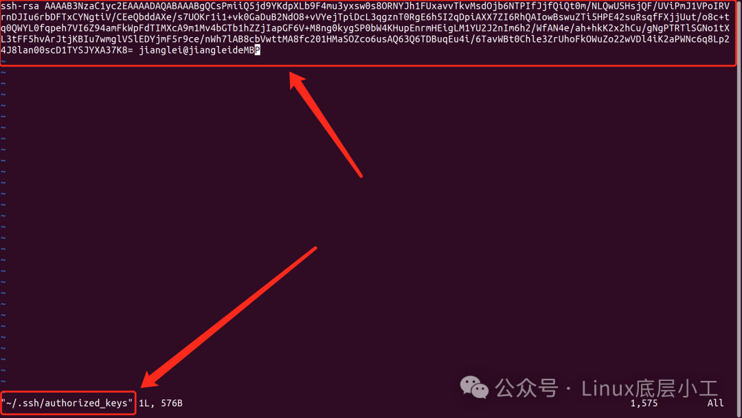 之后,将id_rsa文件中的内容,拷贝到虚拟机的~/.ssh/authorized_keys文件中: