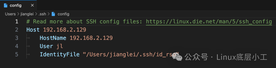 Host 192.168.2.129 HostName 192.168.2.129 User jl IdentityFile "/Users/jianglei/.ssh/id_rsa"