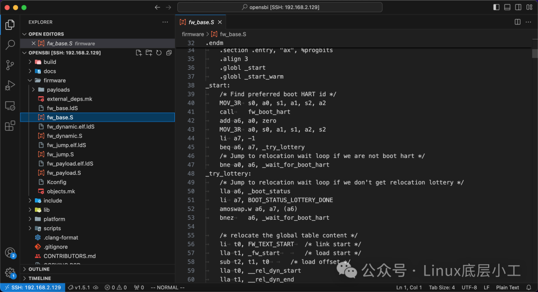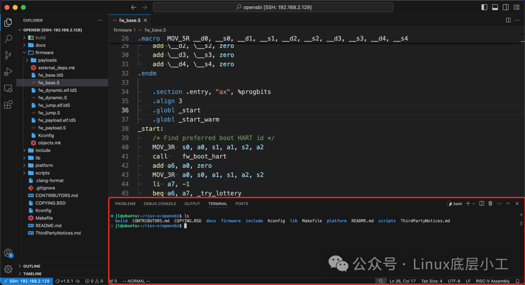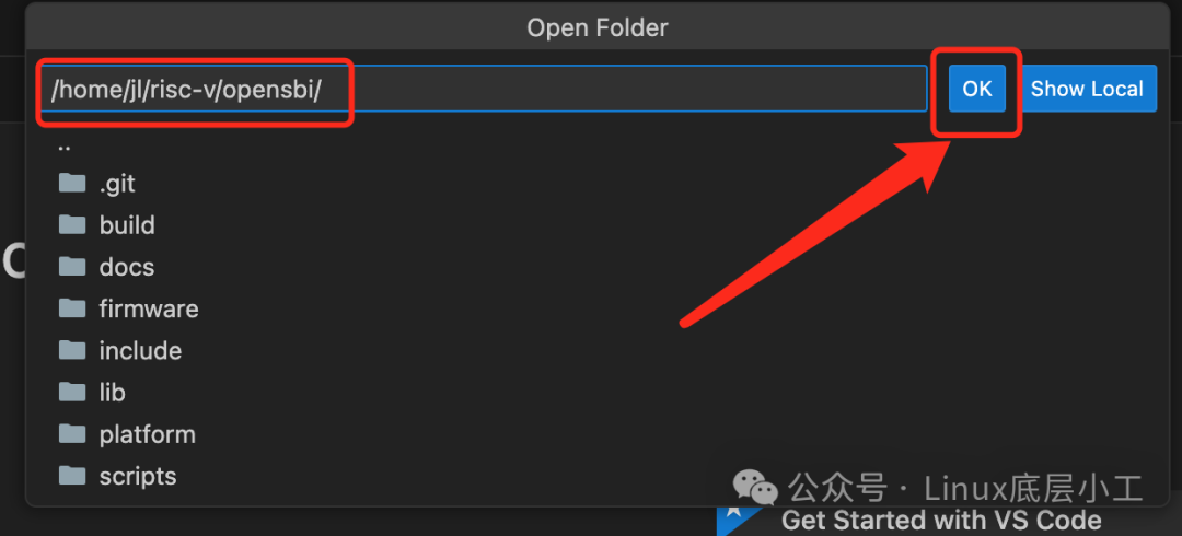 下面,我们以打开OpenSBI源码为例,首先选择VSCode的file菜单,然后选择Open Folder,如下图所示: