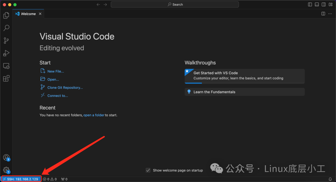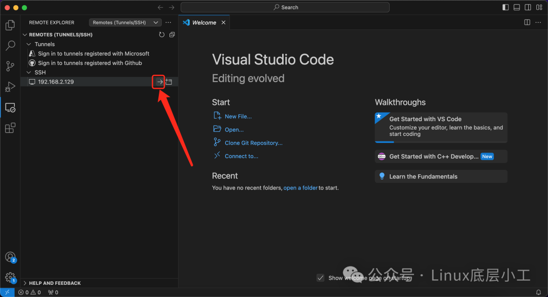配置完成后,在VSCode的ssh下出现了添加的虚拟机,点击后面的箭头在当前窗口进行连接,如下图: