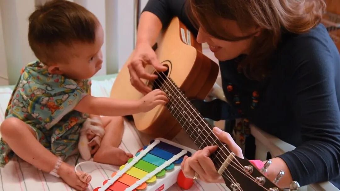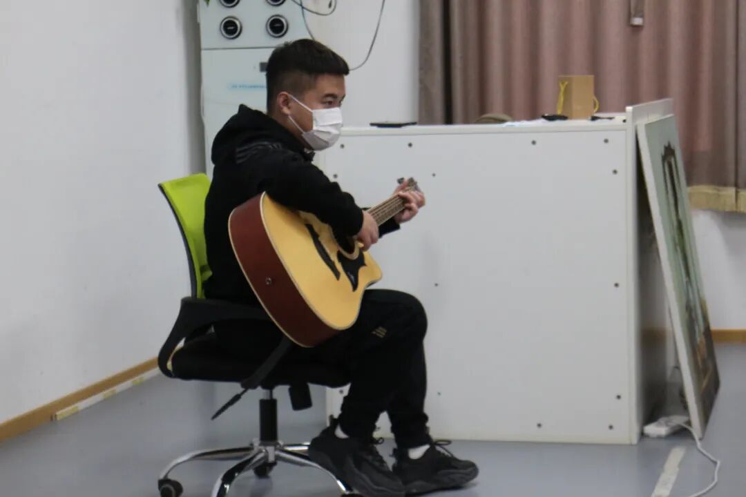 一名正在弹吉他的孤独症青年